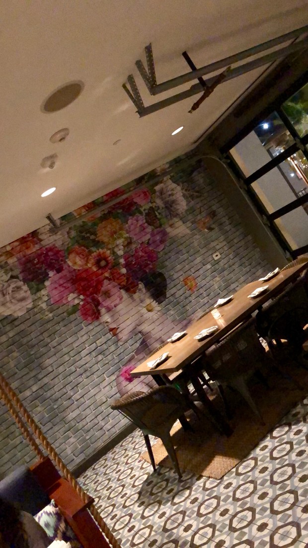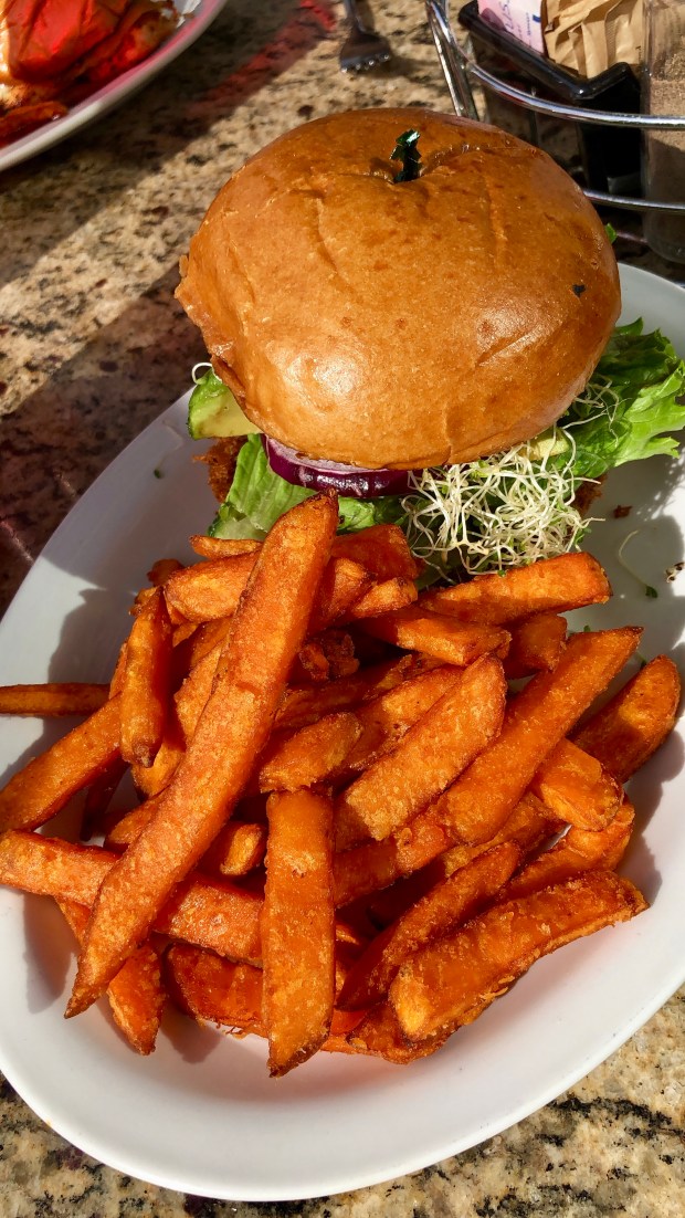 The menu is a mix of Asian and Latin inspired dishes, and it was tough to narrow down a choice. I landed on the Grilled Cali Tacos: Grilled cauliflower, quinoa, squash, hummus, cucumber, quinoa, and red pepper. And of course I couldn’t pass up an order of their Brussels & Jerky. Yum! Yum! Yum!