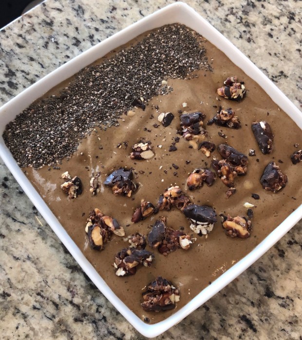 • Place all ingredients (not including toppings) in food processor or Vitamix. (A regular blender will not work, because there is not enough liquid.)