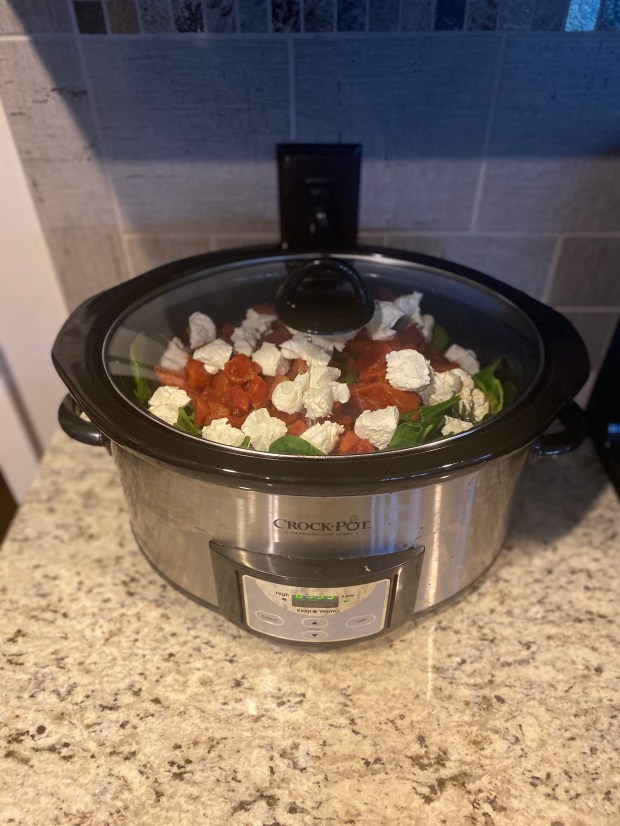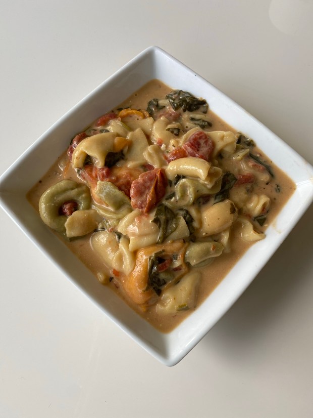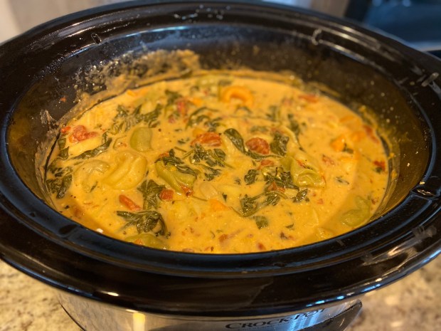 - Dump bag of tortellini into crockpot.